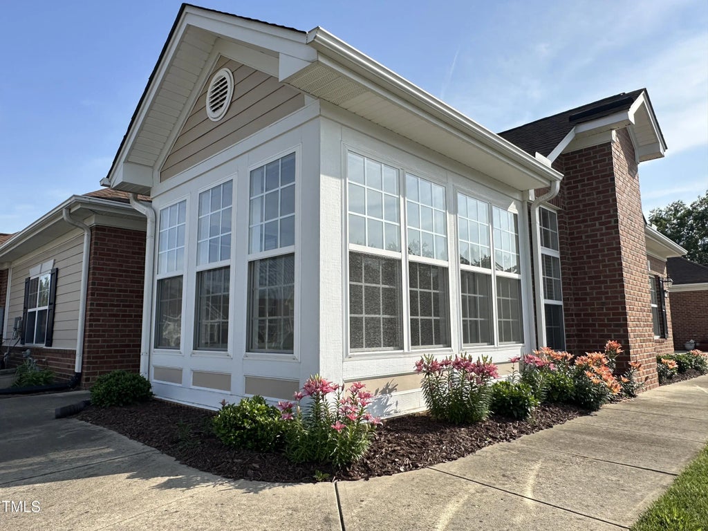 Seller offering $3,000 in closing costs. New Rheem air conditioning unit installed 7/28/2025. This is one-story living at its best. No stairs! And a great location, close to I-540, I-440, and 401. An unbeatable value. This home features spacious, wonderful open and airy spaces that capture the sunshine and bring in tons of natural light. Just wait until you see the outstanding sunroom! The vaulted family room features a beautiful fireplace with gas logs. The second bedroom features a double-door entry with extra space for a library, office, art or music studio. This spacious second bedroom could easily be converted into two bedrooms. The open concept living spaces and large kitchen (refrigerator conveys) make this an exceptional home for anyone who would like to avoid having to climb stairs. The large two-car garage flows well with easy access to the kitchen and pantry. It is an exceptional layout. The vaulted ceiling adds a dramatic flair to this wonderful home. The home has been cleaned and spruced up, ready for you to visit and call this your new home. Enjoy the clubhouse which features a gym, an activity room, library, and large kitchen that is welcoming for large gatherings. This home has maintenance-free exterior and attached 2 car garage. Perfect for downsizing or anyone seeking low-maintenance, single-level living in a desirable neighborhood. Move-in ready and waiting for you!