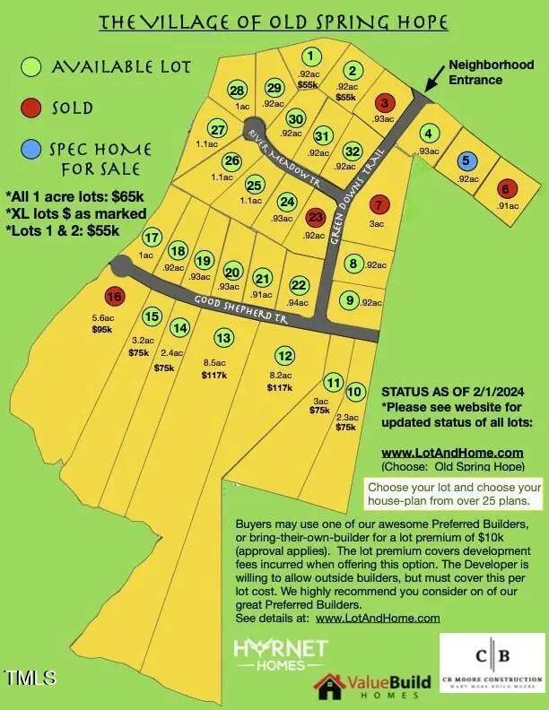 Welcome to 'The Village of Old Spring Hope', Nash County's newest location for modern rural living. Choose from our excellent Preferred Builders who offer unique floor plans that are sure to impress. Homeowners are welcome to Bring-Your-Own-Builder (lot premium applies). Preferred Builders are being accepted. Contact us for details. 'Old Spring Hope' features large lots (approx 1+ acre each up to 8 acres). Come build with us and experience rural privacy & beauty with commerce just minutes away. Conveniently located between Zebulon and Nashville in the beautiful countryside of Spring Hope. Enjoy an easy commute into Downtown Raleigh w/ the neighborhood only 2 miles off of Hwy 64. 'Old Spring Hope' offers 'room-to-breathe' in an upscale neighborhood focused on beautiful design features and quality workmanship. Build with us and call 'Old Spring Hope' HOME!