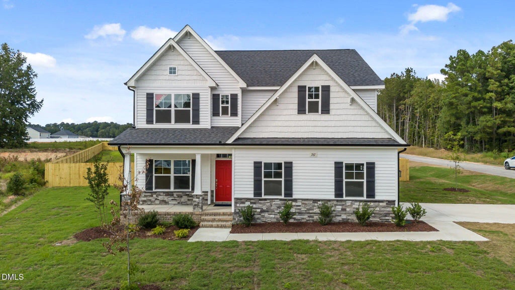 Durable LVP flooring extends throughout the foyer, dining room, great room, kitchen, mudroom, and all bathrooms. The exterior features low-maintenance vinyl siding with shake accents, a stone skirt, and dimensional roof shingles. The front door, painted in Sherwin Williams ''Poinsettia,'' includes a transom window and smart keypad entry for added convenience.