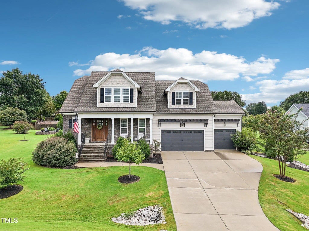Welcome to this stunning custom-built residence. With like new construction, this home boasts a spacious 3-car garage and an expansive yard perfect for outdoor living and entertaining. Enjoy movie nights in your private movie room or take advantage of the community amenities, including two neighborhood ponds with fishing and picnic tables. The main level features a primary bedroom suite complete with spa-like en-suite bathroom, featuring a walk-in shower with a bench, quartz countertops, and separate soaker tub. The heart of the home is the gourmet kitchen, designed for the culinary enthusiast, with granite countertops, gas range, double wall oven, and under-cabinet lighting. The open-concept living space is flooded with natural light from large windows, highlighted by rich hardwood floors and elegant crown molding. Cozy up by the fireplace, framed by a custom stained mantel, or step through the double sliders onto the screened-in porch that leads to a beautifully designed outdoor living area with a gas fire pit and pergola. Additional features include a tankless water heater, stunning Chevron shiplap accent wall and large windows allowing for plenty of natural light.