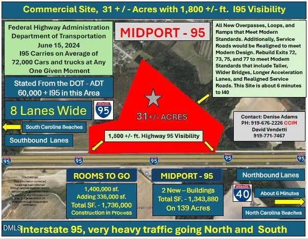 Welcome to a rare opportunity for prime commercial development in the bustling town of Dunn, North Carolina. Spanning 31 acres and ~1,800 ft of highway frontage across five parcels of land, this property offers unparalleled potential for a variety of commercial ventures. Situated just off I-95, this property boasts exceptional visibility and accessibility. Its proximity to the interstate ensures high traffic exposure. Across from the Rooms To Go distribution center, this site benefits from being in the vicinity of established businesses, enhancing its appeal for potential investors and developers. Easy ingress and egress with easy access on and off the interstate via the service road. With the expanding commercial landscape in Dunn, investing in this prime piece of real estate offers significant returns and long-term growth potential. For more information or to schedule a viewing, please contact us today.