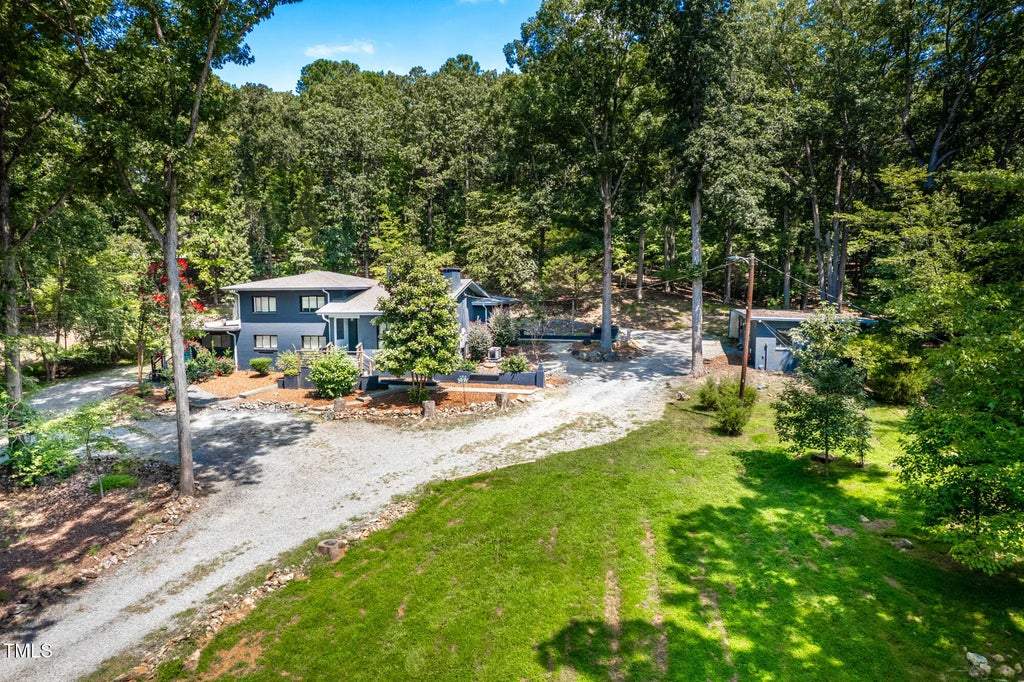 Boundless Beauty on Bivins! Fabulous multi level mid century home on 3.6 acres - wow! Fabulous open concept living, rows of floor to ceiling windows, luscious hardwood floors, generous updated kitchen, very newly updated baths and newly updated primary suite are just of few of the many delights that await! Featuring 4BR, 3BA and several flex rooms with plenty of options for offices, storage, etc. This property will enchant! Situated off road atop a slight slope, this stunning home offers tranquil living surrounded by a forest of mature trees, great garden spaces (lots of fresh blueberries in the early summer!), a smattering of outbuildings and so much more! Also boasting a separate 800+ workshop/studio/gym that you can make your own! Tons of storage throughout! And in addition - new roof 2021, new well 2022, Aquasana whole house water filter 2022, whole house generator 2023, new outdoor Google cameras, nest remote locks, smart thermostats and video doorbells - outstanding! This folks is a special property offering a sense of rural living while maintaining easy access to all that is Durham! Come see! And while there, be sure not to miss the goats!
