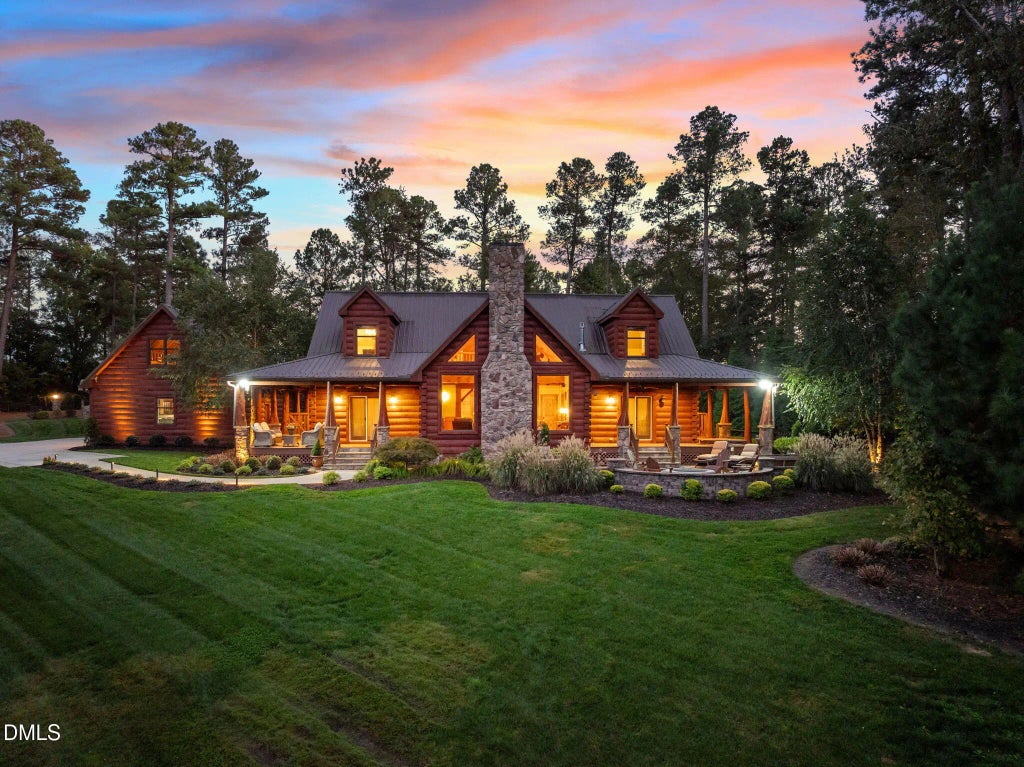 Imagine your perfect zen lifestyle. Truly a unique indoor-outdoor living experience. Built in 2014, this log home has all the must-have modern amenities and more. Private, gated retreat on nearly 8 acres. Enticing views of the stocked pond -- a calming experience watching the blue herons and bubbling fountain. The vaulted great room features a central tree column harvested from the property, plus custom fireplace mantle logs from New Bern with a history lodged inside--a civil war bullet! Primary suite on the main level has gas log fireplace, walk-in closet, spa bath with whirlpool, views of the pond, and direct access to the deck plus hot tub/spa. First floor living is maximized with another bedroom and full bath on the main. Two additional bedrooms, full bath and loft sitting area complete the second level. Home automation to the max with finger tip controls for cameras, locks, indoor/outdoor lighting, shades & irrigation. Enjoy quiet mornings and evening on the wrap-around deck crafted from cypress trees imported from Mississippi, copper fittings & custom stone accents. The pond-side patio features a built-in fire pit. Additional outdoor features include the screened gazebo, fenced backyard, and detached office/guest/artist retreat. The three-bay garage with a built-in EV charger, is a dream for private car collections. Enjoy the unfinished space above for storage or custom finishing. Peace of mind amenities include the whole-house generator, surge protection, and an 100amp circuit in garage. Convenient access to UNC/Chapel Hill, Duke/downtown Durham and Greensboro-- all 25-30 minutes travel time.