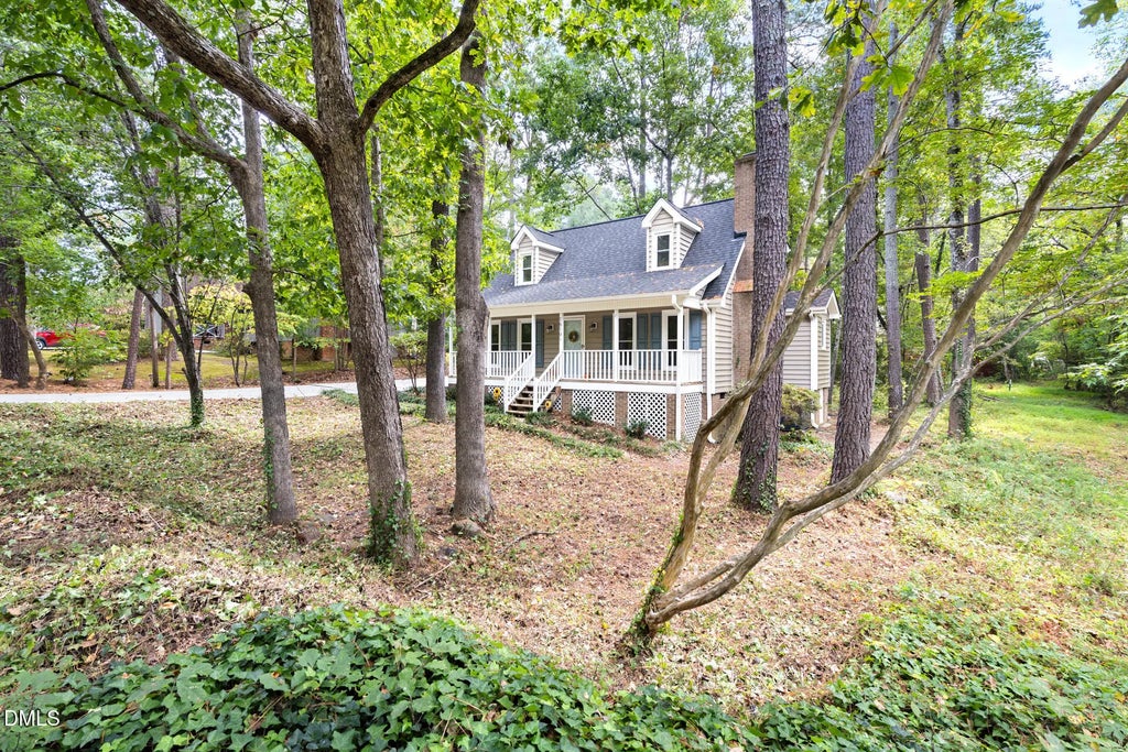 Goldilocks would fancy 1619 Rowemont as JUST right! Not too big but not too small, there really is a house available in this market that has it ALL. Classic cape cod curb appeal meets move-in-ready comfort in this charming home situated on an oversized wooded lot. Rocking chair front porch extends the full width of the home. Enjoy a cup of joe as you relax in your own personal oasis. Inside, you'll find a well-cared for home with new roof (2025), newer carpet, refreshed kitchen and baths (2024), a wood-burning fireplace, new HVAC and ductwork (2024), and so much more! The floor plan provides a first floor bedroom, which can be utilized as the primary bedroom or a guest room/office. Outside, relax on the back deck overlooking a large yard shaded by mature trees with a parmanent chicken coop. With the newly Whippoorwill Park just a short stroll away, this home offers the perfect blend of comfort, character, and community in one inviting package. 6 minutes to Costco, 9 minutes to 9th Street, and less than 20 min to RTP as well!