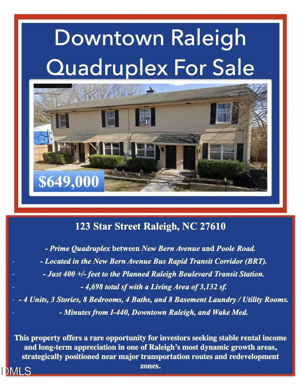 Downtown Raleigh Quadruplex For Sale — $649,000 Prime Investment Opportunity in the New Bern Avenue BRT Corridor. Discover this exceptional quadruplex perfectly situated between New Bern Avenue and Poole Road, in the heart of Raleigh's fast-evolving Bus Rapid Transit (BRT) corridor. Strategic Location: Just 400 ± feet from the planned Raleigh Boulevard Transit Station. Spacious Design: 4,698 total SF with 3,132 SF of living area. Layout: 4 Units, 3 Stories, 8 Bedrooms, 4 Baths, and 8 Basement Laundry/Utility Rooms. Accessibility: Minutes to I-440, Downtown Raleigh, and WakeMed Hospital. This property represents a rare investment opportunity offering both steady rental income and long-term appreciation potential. Positioned near major transportation routes, planned transit infrastructure, and ongoing redevelopment, this site is ideal for investors looking to capitalize on Raleigh's continued urban growth.