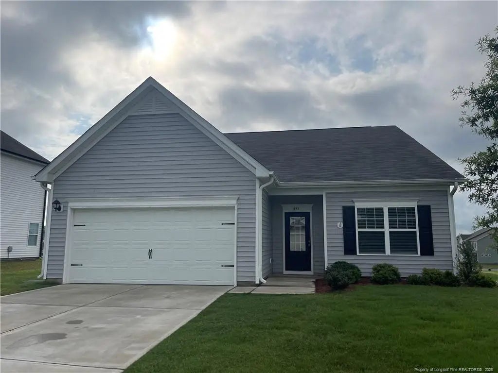 MOVE IN READY HOME. This lovely 3 Bedroom 2 bathroom Ranch home located in 78 South in Lee County. This 2022 home sits on a large corner lot and has a double car garage and rear covered patio. This home features a large open plan. The Eat in kitchen has granite counters, a center island, lots of cabinets and stainless steel appliances. The living room has vinyl plank floors a ceiling fan and access to the rear porch. The owners suite has carpet in the bedroom, a walk in closet, and bathroom with a garden tub and private potty area. You will find 2 more bedrooms with carpet and blinds and a laundry room. 78 South is a HOA community deed restrictions apply.