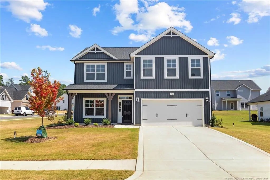 The Pamlico. Formal dining room off of foyer painted in Sherwin Williams ''Software'' with coffered ceiling painted in ''Agreeable Grey'' and craftsman style wainscoting detail. Open kitchen with island overlooking the great room, quartz countertops in ''New Willow White'', natural stone herringbone mosaic backsplash, corner pantry, and breakfast area; Stainless steel microwave, dishwasher, and gas range. Great room with corner gas log fireplace with decorative mantle and granite surround in ''Absolute Black'' and rear porch access through sliding glass door. Guest room located on the first floor with hall access to full bathroom with vanity, and tub/shower combination. Staircase with painted wood balusters. Second-floor primary suite with tray ceiling and crown molding; Primary bathroom with access to spacious walk-in closet, dual sink vanity with shaker cabinets in ''Espresso'' and center drawer stack, quartz countertop in ''Niagara'', linen closet, walk-in tile shower, private water closet, and tile flooring. Second-floor laundry room with washer/dryer connections and lvp flooring. 3 additional bedrooms on the second floor - all with walk-in closets and hall access to full hall bathroom with vanity, tub/shower combination, linen closet, and lvp flooring. Open loft space on second floor with hall linen closet! Durable luxury vinyl in the foyer, formal dining room, kitchen/breakfast area, great room, and half bath. Front door painted in Sherwin Williams ''Black Magic'' with transom window and single sidelight providing natural light in the foyer. Access with smart keypad! Low maintenance vinyl siding with board and batten accents; Dimensional roof shingles. 2-car front-loading garage. Fiber Optic Internet service is available! Energy Plus Certified with a 1-2-10-year builder in-house warranty.