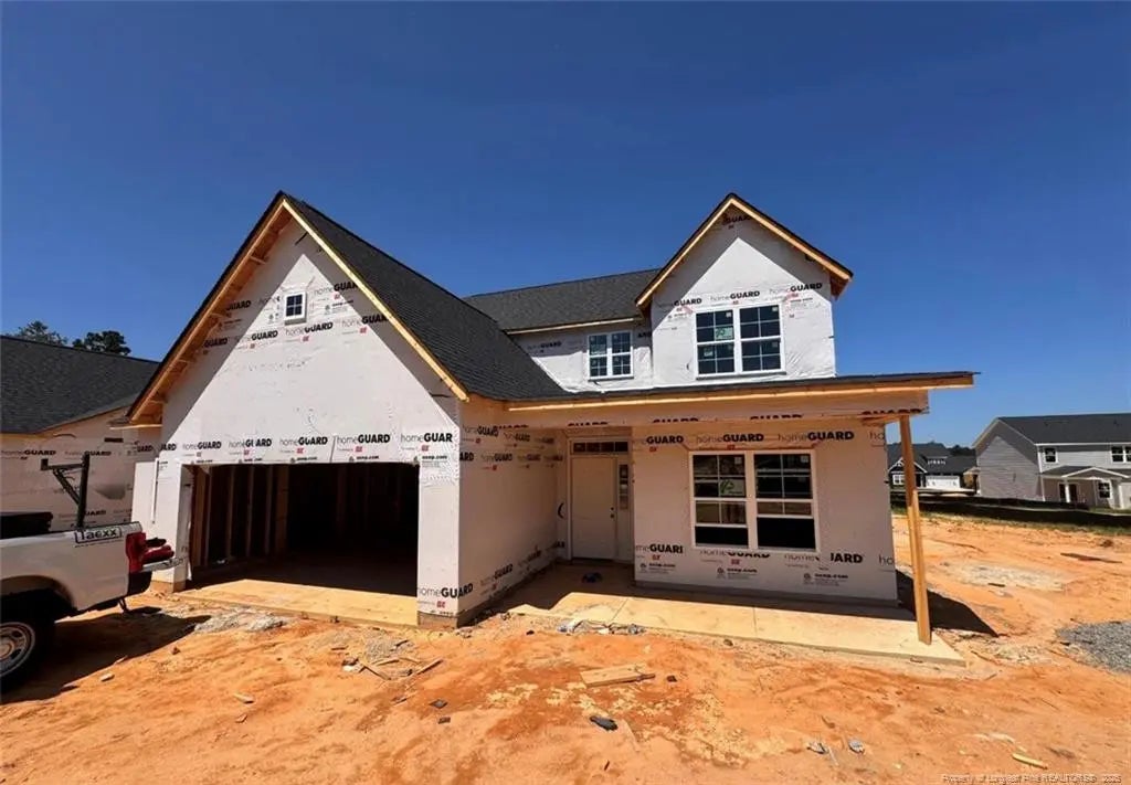 The Camellia. This corner lot home features a formal dining room off the foyer, painted in SW ''Gale Force,'' with direct kitchen access. A mudroom with a built-in coat station sits near the garage entry, next to a convenient half-bath. The kitchen offers ''Arctic White'' quartz countertops, white shaker cabinets, white subway tile backsplash, pantry, bar seating, and stainless-steel appliances including a microwave, dishwasher, and gas range. The open great room includes a gas log fireplace with a mantel and black granite surround and access to rear covered porch. The first-floor primary suite features a tray ceiling with crown molding and an en-suite bath with a walk-in closet, white dual sink vanity with center drawer stack and ''Niagara'' quartz countertop, a walk-in tile shower, linen closet, and private water closet. Upstairs, a loft connects to three additional bedrooms, a laundry room, a linen closet, and full bath with a vanity and tub/shower combination. LVP flooring runs throughout main living areas. Exterior showcases vinyl siding with board and batten accents, dimensional roof shingles, and a front door in SW ''Sea Serpent'' with a transom, sidelight, and smart keypad entry. Additional features include a two-car garage with a work area, Energy Plus Certification, fiber optic internet availability, and a 1-2-10 builder in-house warranty.