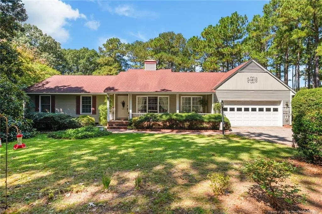 Nestled along the 3rd fairway of the Carolina Trace Lake Course, this home combines comfort with scenic views. A charming front walkway welcomes you to the covered porch—perfect for a set of rocking chairs. Inside, the floor plan features a bright kitchen with an island and double stainless-steel sink, a formal dining space, and a front living room framed by triple windows. The vaulted great room flows into a sunroom lined with floor-to-ceiling glass, offering sweeping views of the course and direct access to the back deck. The primary suite includes a walk-in closet and bath with dual vanities, a stall shower with seat, and plenty of storage. Two additional bedrooms and a guest bath provide space for family or visitors. A separate laundry room and a two-car garage equipped with shelving and a workbench add to the convenience. The landscaped backyard offers privacy and a tranquil retreat. Carolina Trace Country Club membership is available, granting access to casual and fine dining, a pool, fitness center, tennis, pro shop, snack bar, and two acclaimed 18-hole golf courses. Non-golfers will also find a variety of social and recreational activities to enjoy.